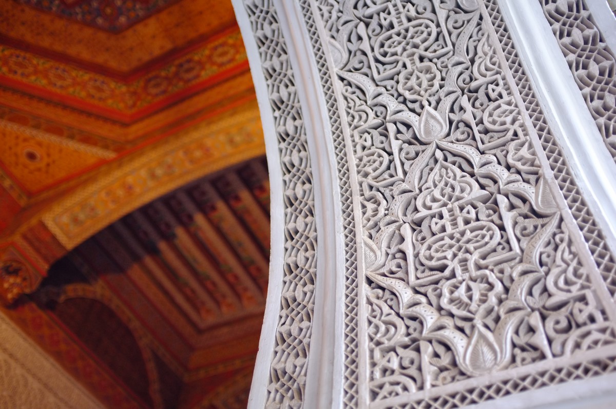 Close-up on wall & ceiling work at the El Bahia Palace (Vizier Palace in Marrakech)