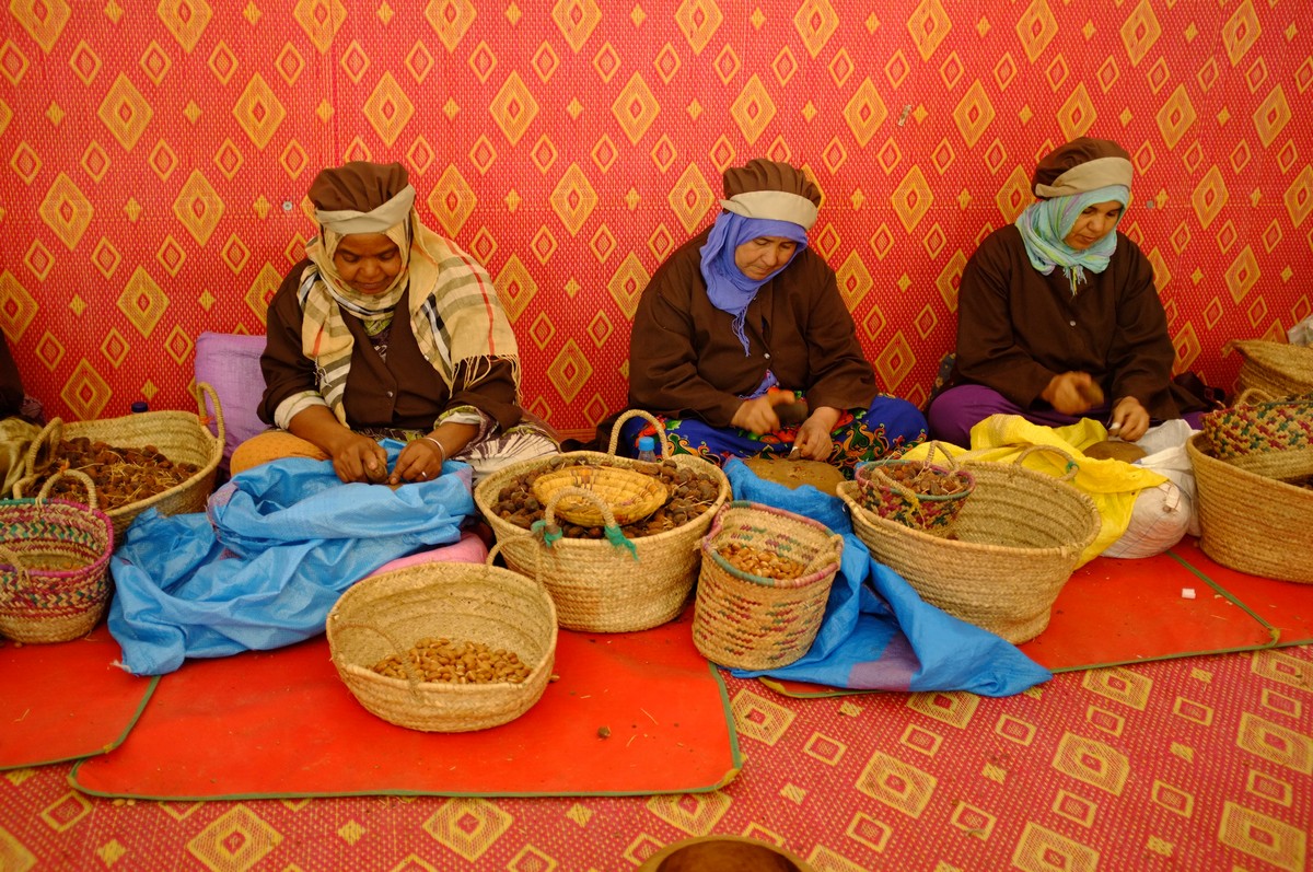 On the road to Essaouira: Argan oil is produced by several women’s co-operatives in the southwestern parts of Morocco. The most labour-intensive part of oil-extraction is removal of the soft pulp (used to feed animals) and the cracking by hand, between two stones, of the hard nut. The seeds are then removed and gently roasted.